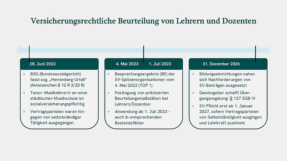 Nach der Übergangsregelung in § 127 SGB IV soll eine Feststellung des Sozialversicherungsstatus von Lehrkräften als abhängig beschäftigt durch die Sozialversicherungsträger bis zum 31. Dezember 2026 ohne Wirkung bleiben; d. h. die Versicherungspflicht soll erst ab dem 1. Januar 2027 beginnen. Dies gilt immer dann, wenn