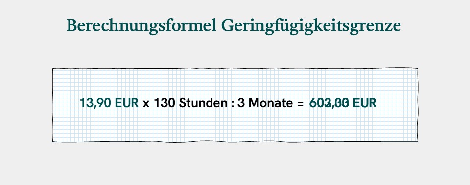 Berechnung: Als dynamische Obergrenze für einen Minijob orientiert sich die Geringfügigkeitsgrenze an einer Wochenarbeitszeit von 10 Stunden zum gesetzlichen Mindestlohn. Der gesetzliche Mindest-Stundenlohn wird mit 130 Stunden (13 Wochen pro Quartal multipliziert mit 10 Stunden) vervielfacht, durch 3 Monate geteilt und der sich daraus ergebende Betrag wird auf volle Euro aufgerundet. Eine wöchentliche Arbeitszeit von 10 Stunden entspricht einer Arbeitszeit von 43 Stunden und 20 Minuten im Monat.