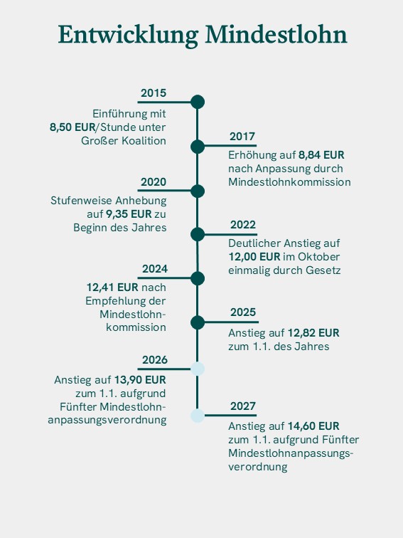 Die Mindestlohnkommission hat alle zwei Jahre über eine Anpassung der Höhe des gesetzlichen Mindestlohns zu beschließen (§ 9 Abs. 1 MiLoG) – heißt also bis zum 30. Juni 2025 für die Jahre 2026 und 2027. Am 27. Juni 2025 erfolgte der fünfte Beschluss mit einer Erhöhung in zwei Stufen (jeweils brutto je Zeitstunde):